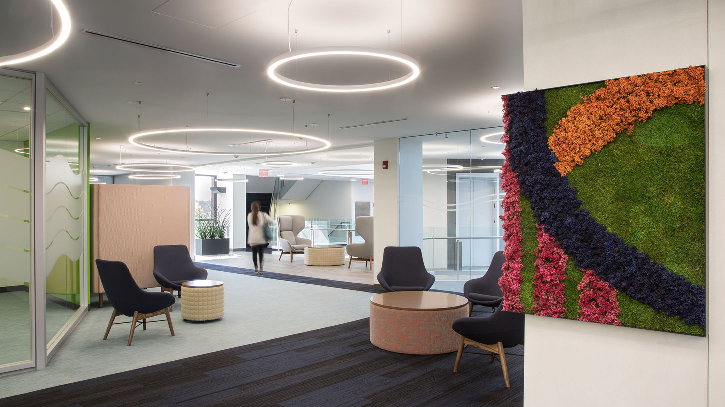 Dicerna was able to secure even more space on the first floor of the same building and a beautiful new welcome center features a large reception area, as well as multiple meeting and presentation rooms. It also includes seating for 80 more employees.