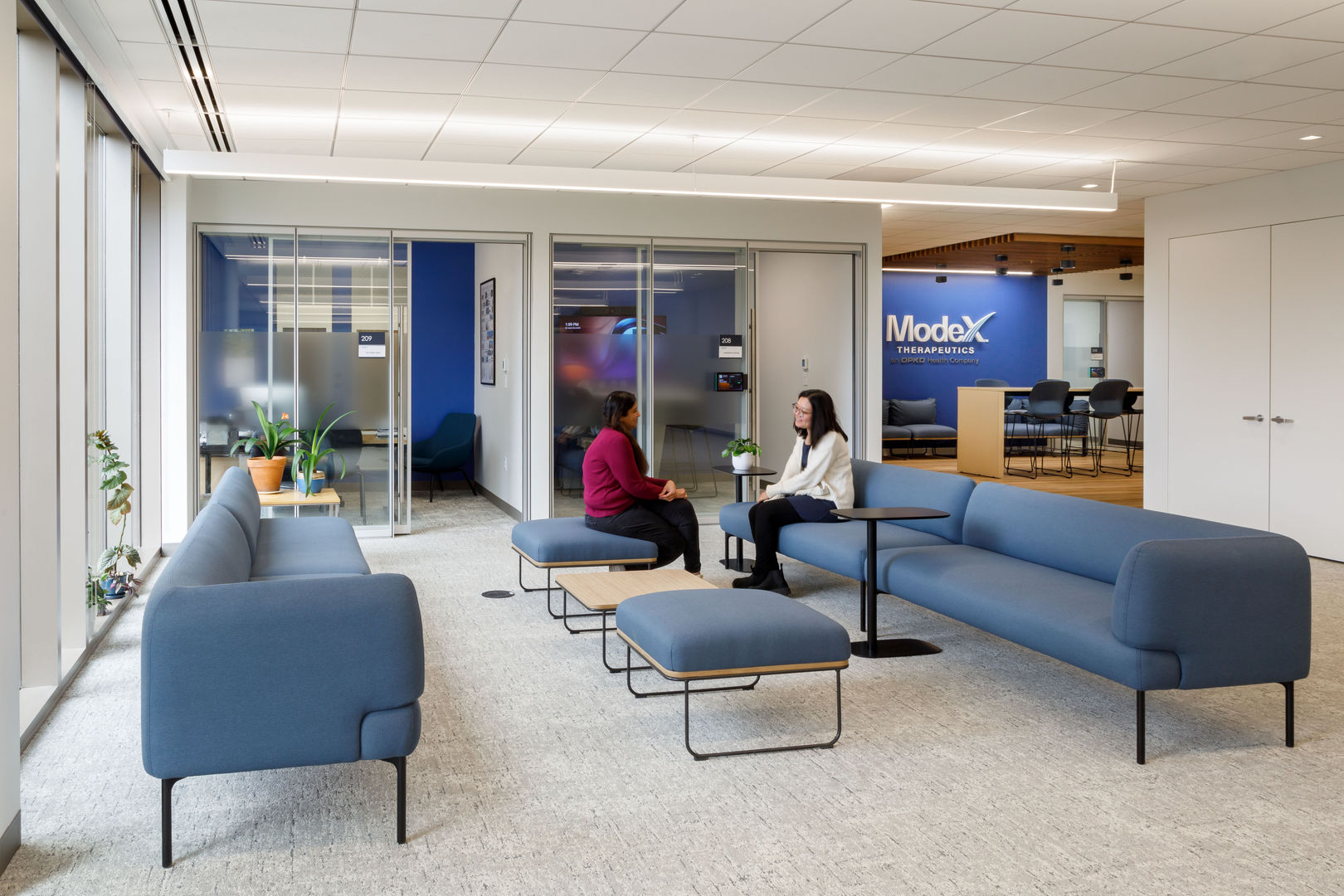 With a usable area of approximately 25,000 SF, ModeX is currently a full-floor tenant on the second floor of Riverside Labs in Weston, MA. The state-of-the-art facility, developed by Greatland Realty Partners, was a perfect fit for an innovation driven company such as ModeX. The building’s “L ’shaped floorplate allowed VIVO to maintain a close connection between the research labs and the office areas, with multiple points of access stitching together the various work zones. There is even access to the lab directly from the reception room, underscoring the prominence of the R&D spaces within the suite.