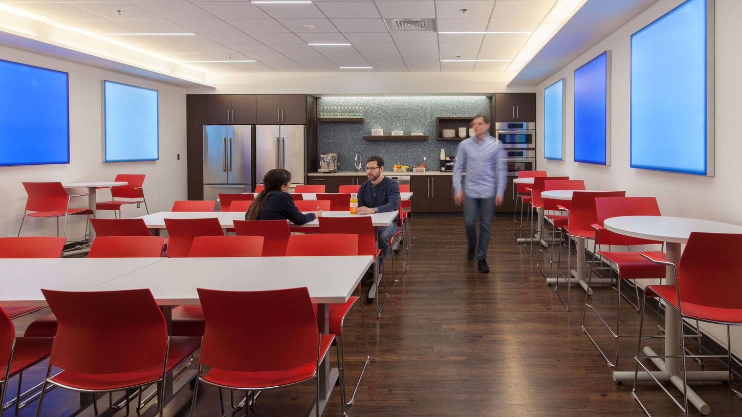 On the 3rd floor, one enters the reception area which proceeds to the executive area, private offices, 2 person shared offices, and an open office administrative area. RaNA’s program called for this area being visually and physically separated from the office functions which support the scientists. A color palette of cool grays and blues further enhances this distinction. A suspended cloud structure, with integrated lighting, over the office administrative area creates an intimate zone. Nearby, is a large board room and small kitchenette. The large open area in the center of the office, with additional shared offices and small breakout conference rooms has a warmer pallet of colors. This supports the scientists in the adjacent labs. There are two lab areas: a Biology lab with two tissue culture labs, cold rooms and radiology lab, and the Chemistry lab with an analytics lab and mass spec. A large cafe provides a focal point for company-wide meetings and socializing. A light cove on the perimeter creates the illusion of added ceiling height. Because there were no exterior windows 3-form light boxes on the walls create light with added depth and color.